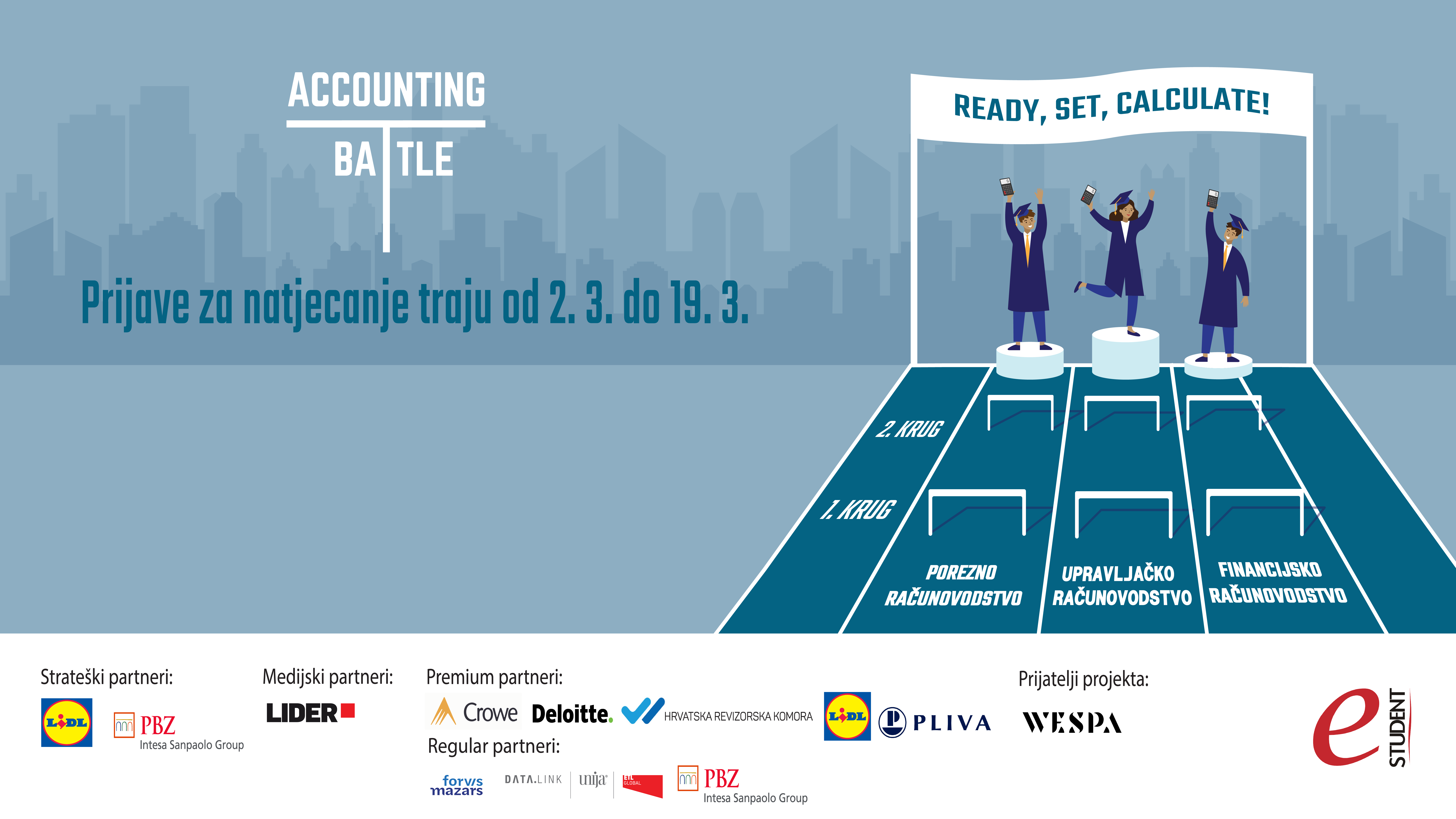 Prijave su otvorene do 19.3, a prvi krug natjecanja održava se u online formatu 23.3. Finale se održava 26.3 u prostoru WESPA Spaces. Na Accounting Battle možete se prijaviti putem forme <https://form.jotform.com/260542617733053>. Riječ je o projektu koji organizira eSTUDENTova Accounting Battle radna skupina, a cilj je povezati akademsku i gospodarsku zajednicu te pružiti studentima priliku za praksu i stjecanje novih znanja u smjeru računovodstva.